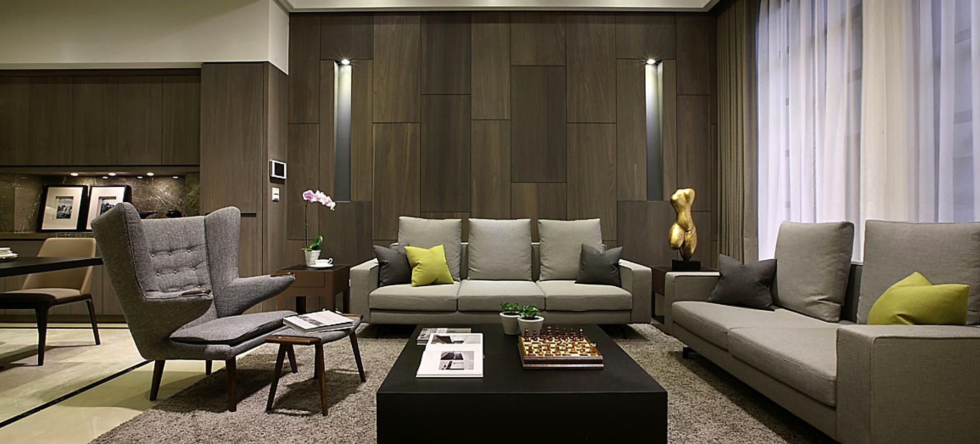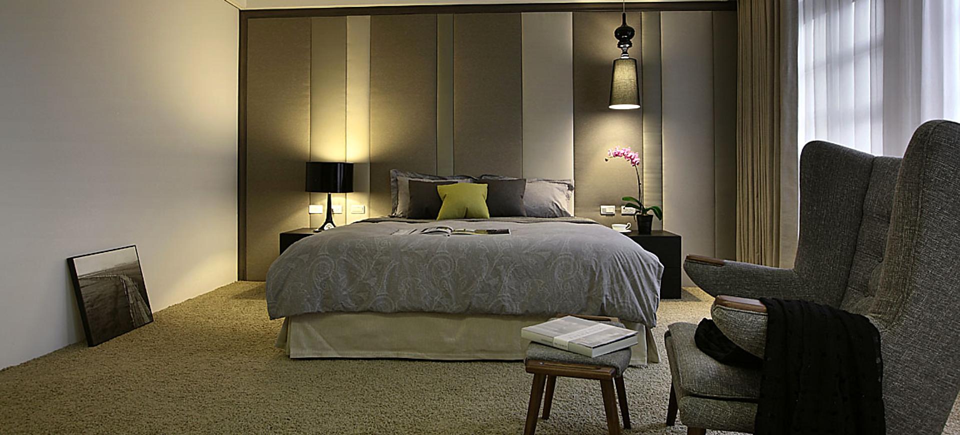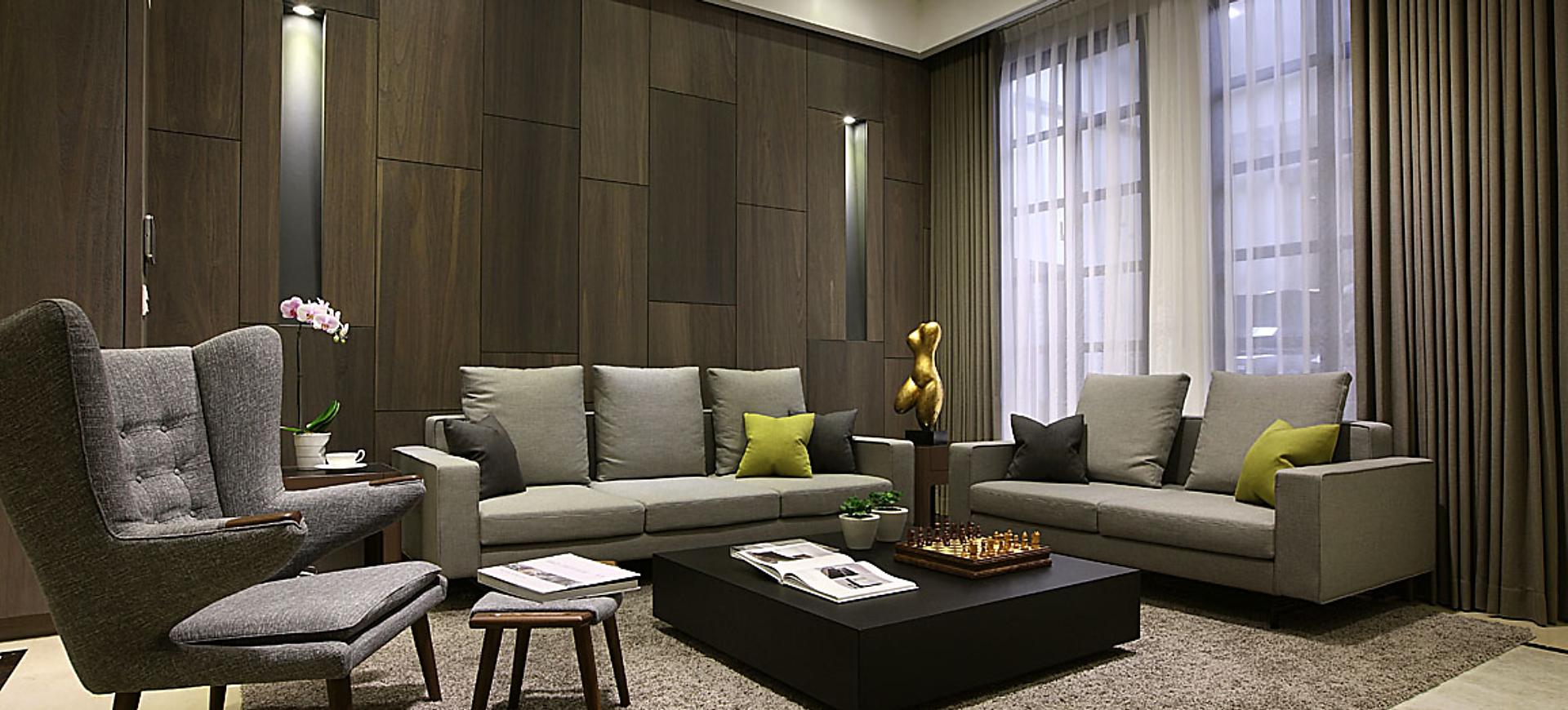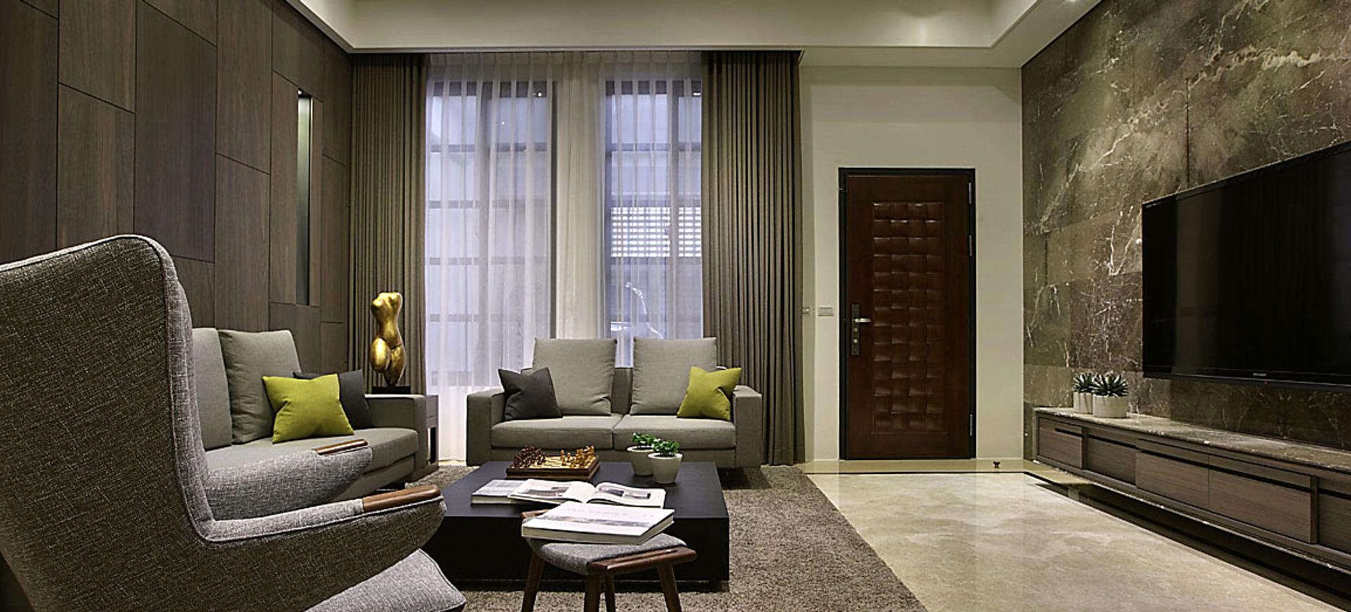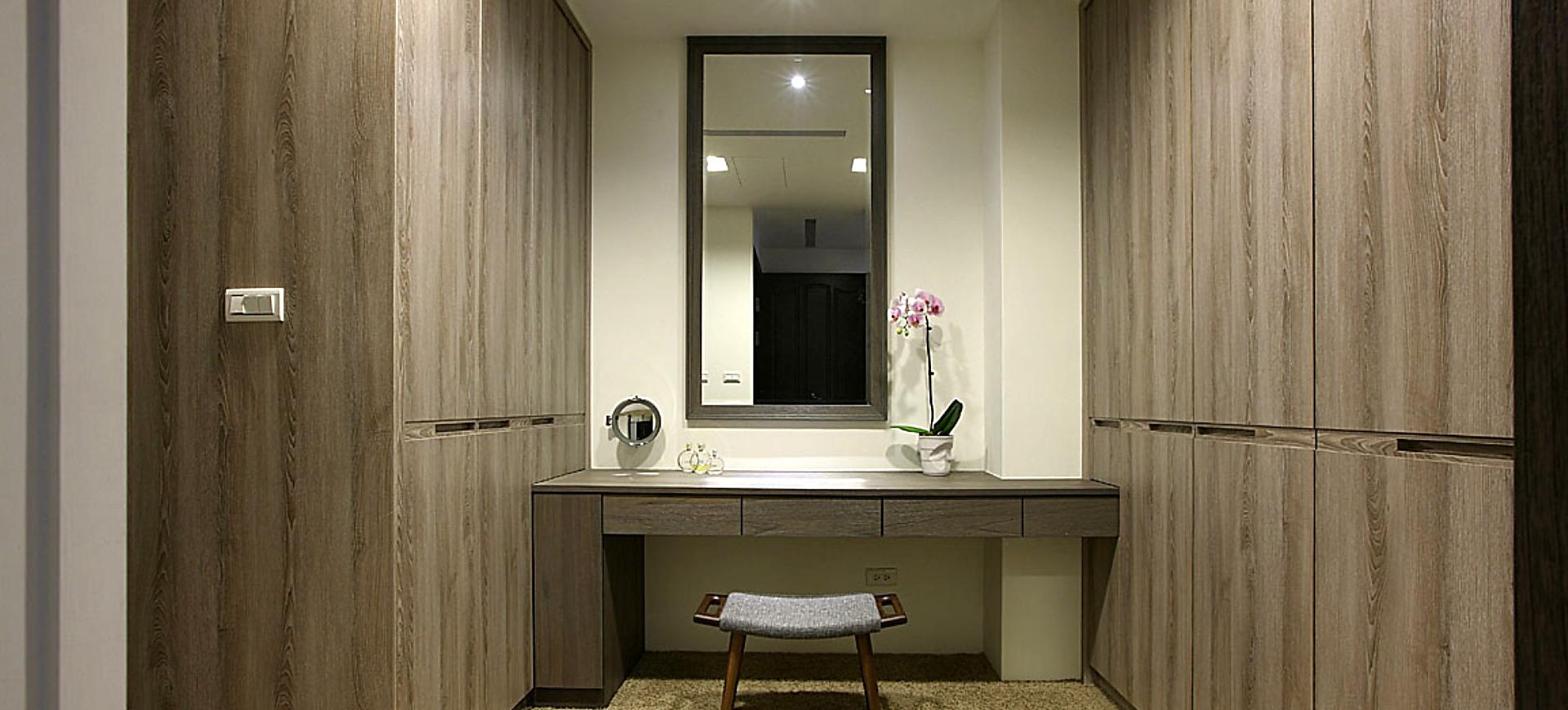 主要建材:梧桐木噴砂木皮、石材、木作烤漆、繃布、地毯、茶色玻璃