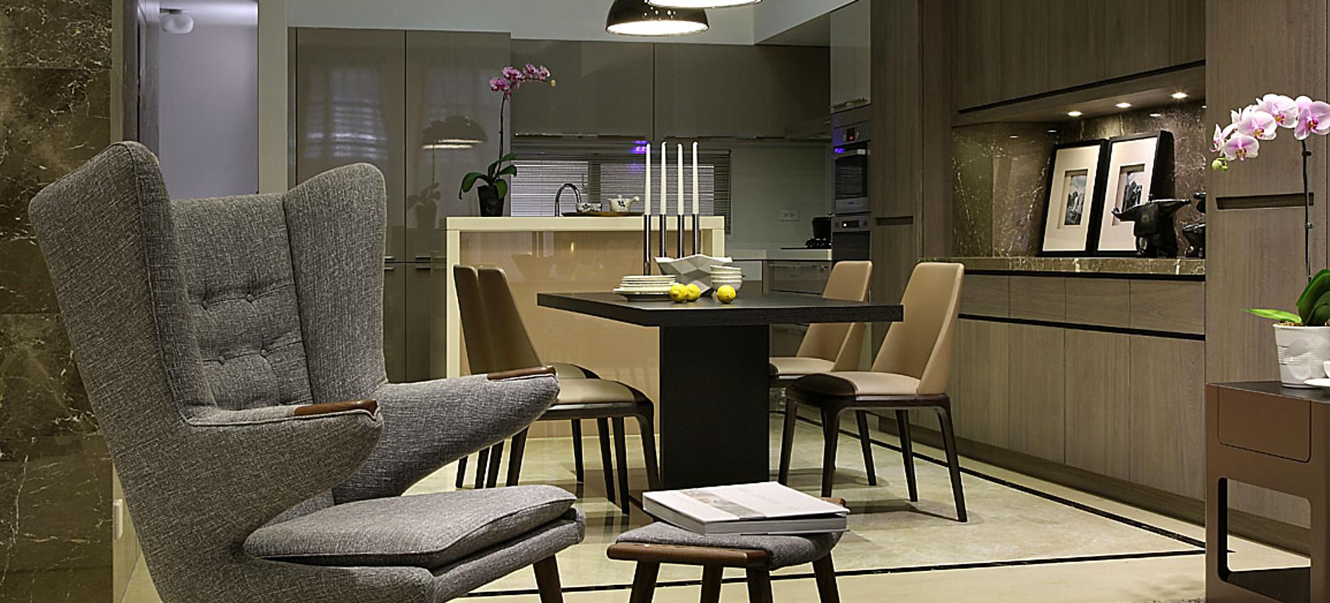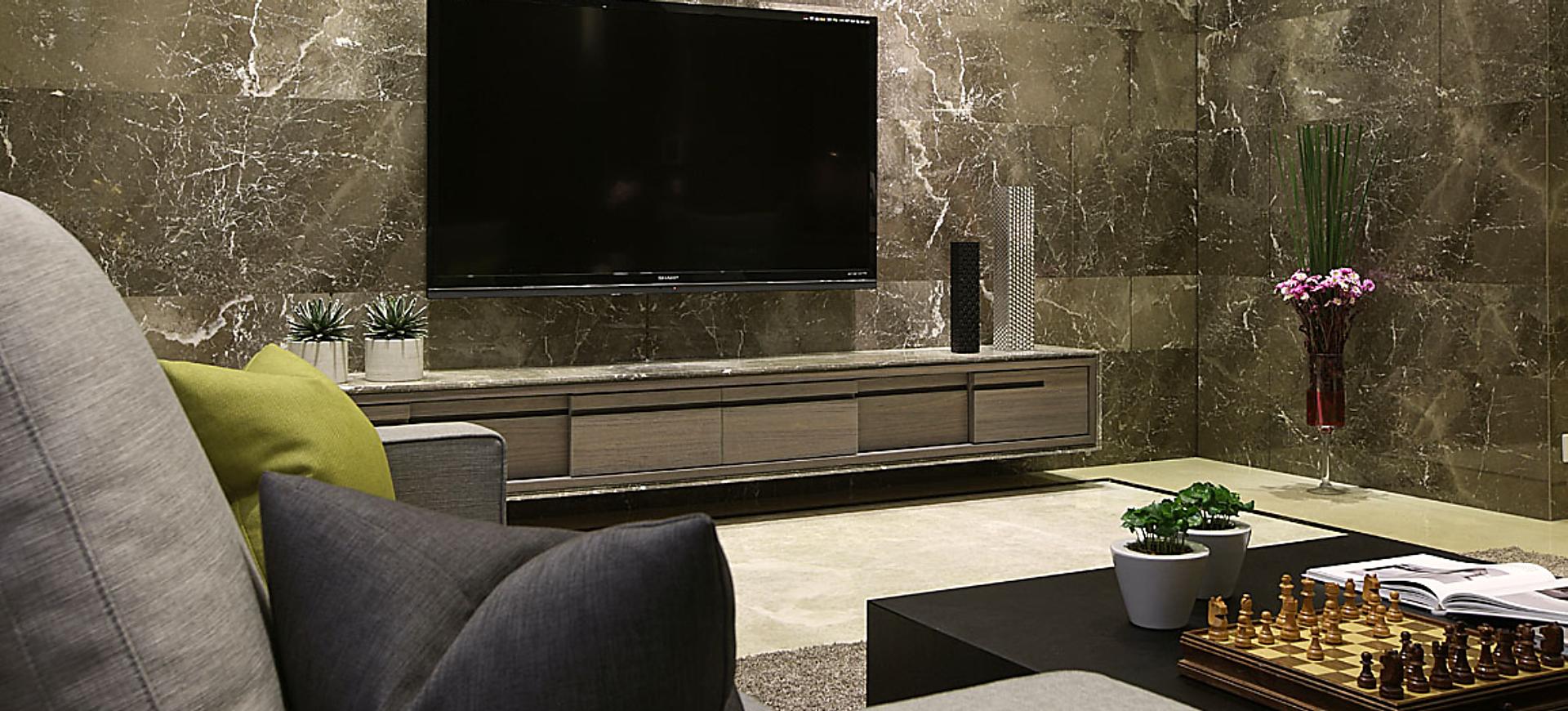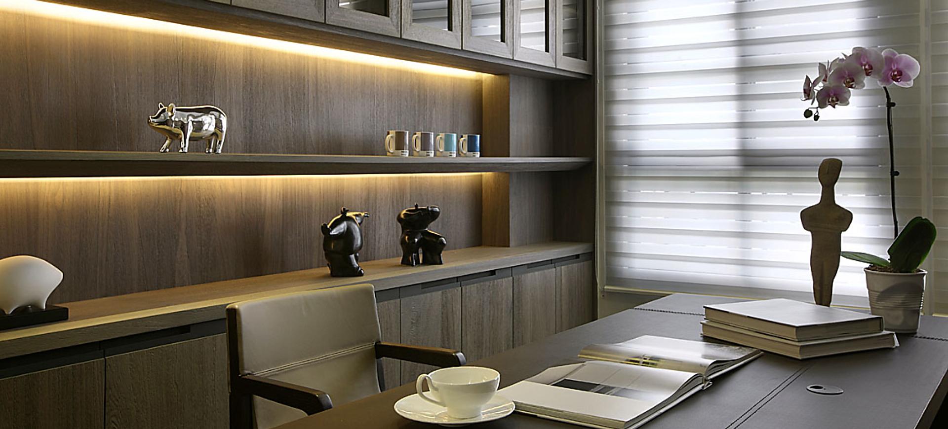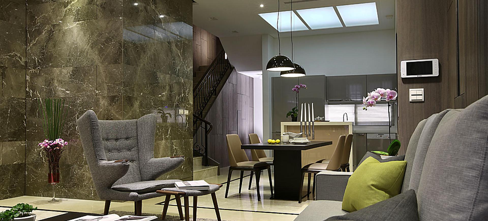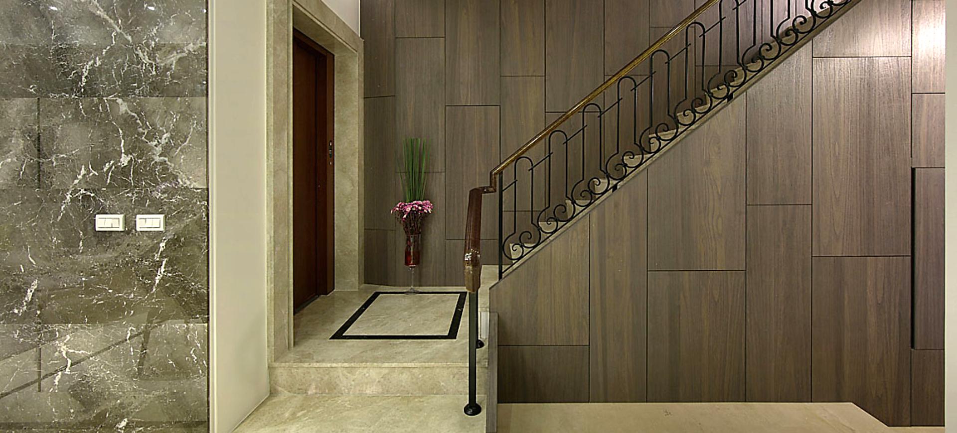 主要建材:梧桐木噴砂木皮、石材、木作烤漆、繃布、地毯、茶色玻璃