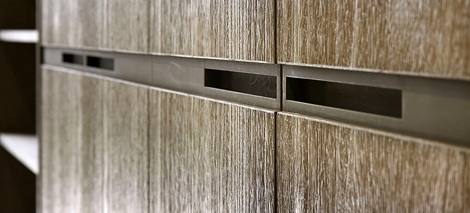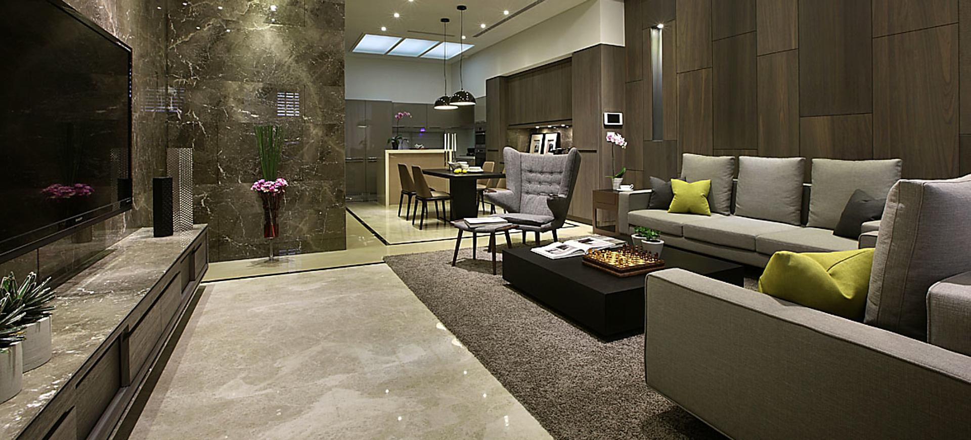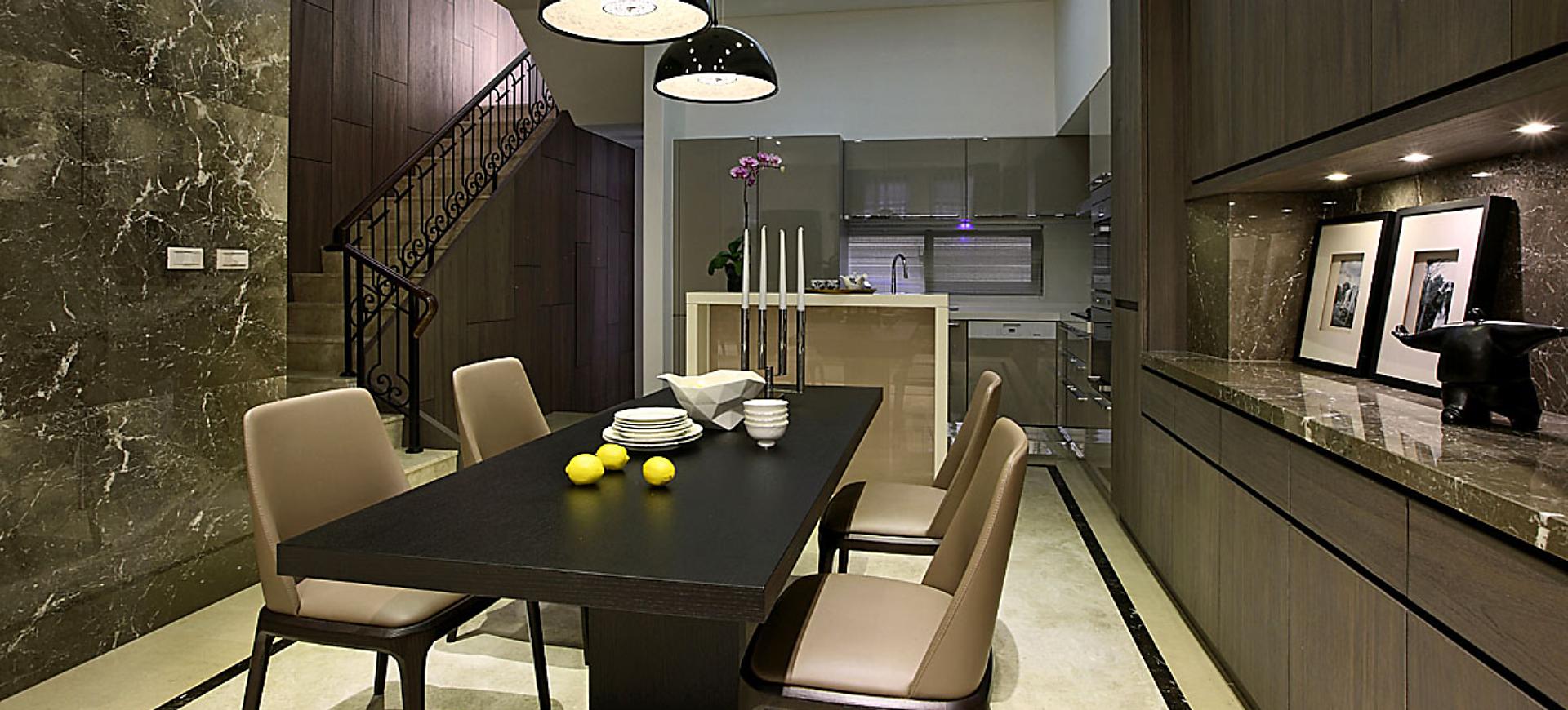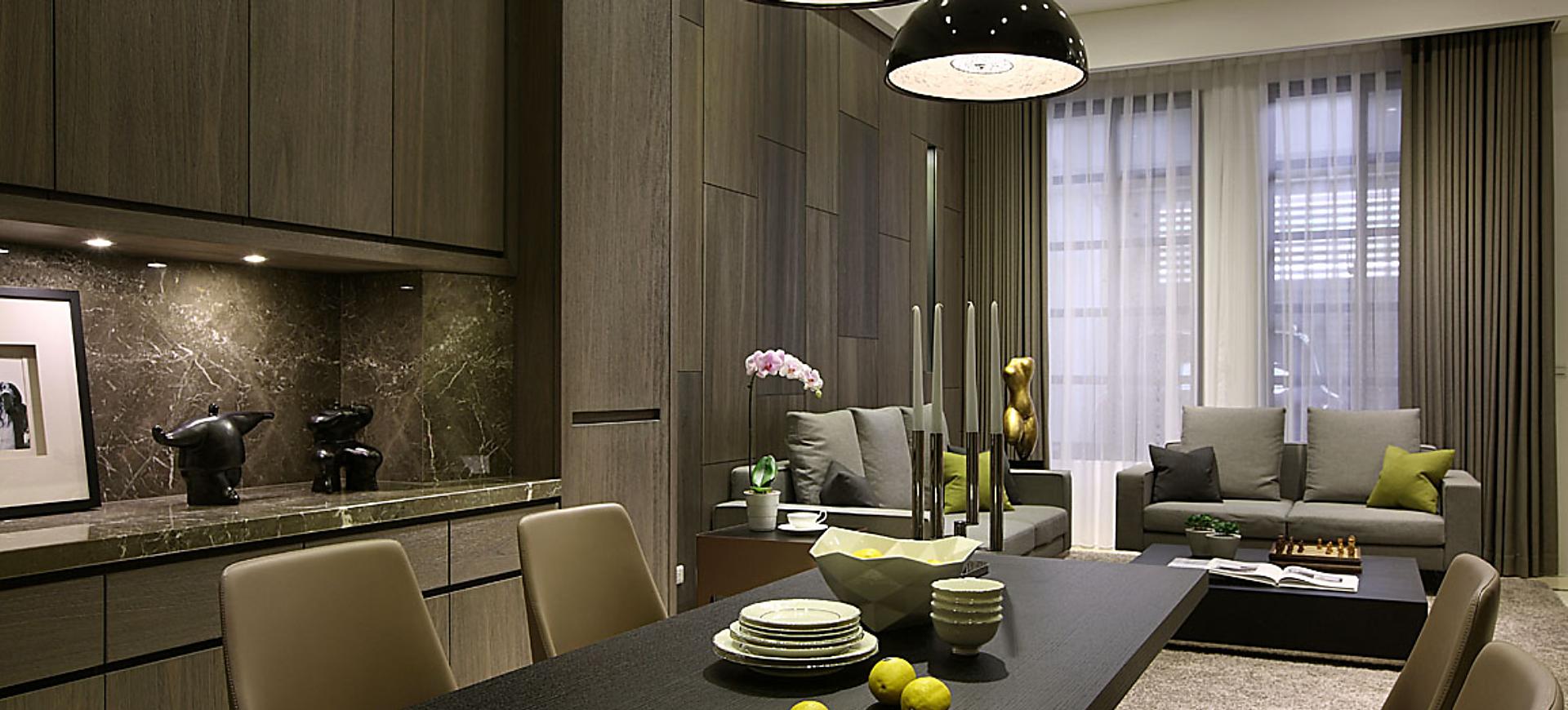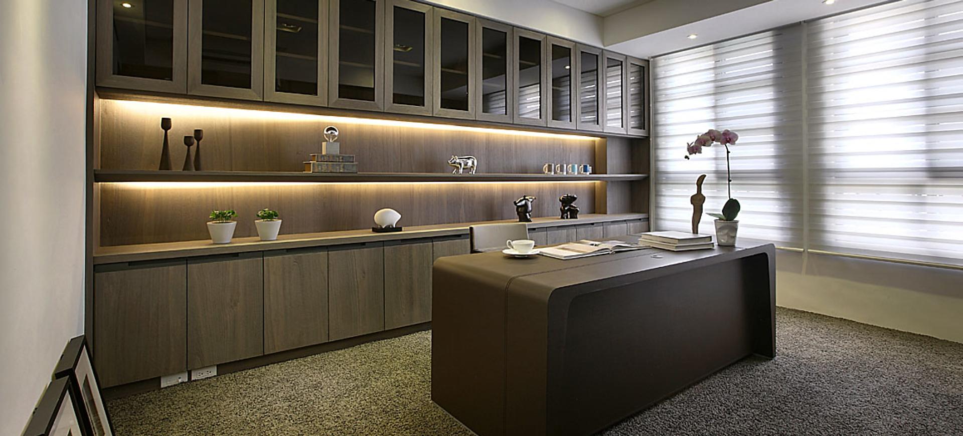 主要建材:梧桐木噴砂木皮、石材、木作烤漆、繃布、地毯、茶色玻璃